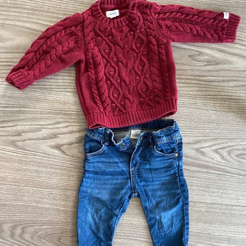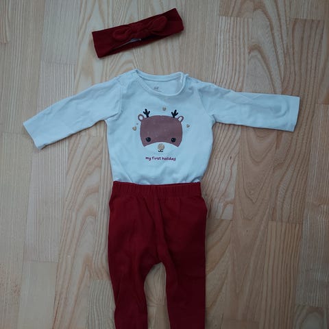Ihana talvikuviollinen neulehaalari/oloasu, jossa haaroissa napitus vaipan vaihtoa helpottamaan, sekä rintakehällä napit pukemista helpottamaan. Pientä kokoa mielestäni, vaikka joustaa jonkin verran. Lisäksi kevyet farkut, jotka myöskin 62cm kokoa, mutta sopivat erinomaisesti yhteen vaalean kauluspaita bodyn kanssa, joka 56cm. Tässä siis siisti kokonaisuus juhliin; alkuun farkut ja kauluspaita, myöhemmin rennompaan pukeutumiseen neulehaalari.