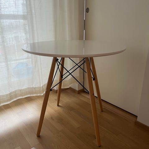 Ajattoman tyylikäs valkoinen ja korkeakiiltoinen ruokapöytä pieneen tilaan, jossa ruokailla mahtuu hyvin 4-henkilöä. Kunto yleisilmeeltään siisti!