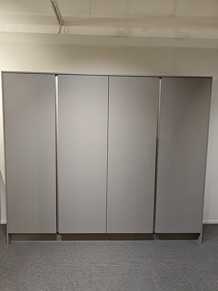 Myydään hiekan sävyisillä etulevyillä varustetut kaapit, komerot ja laatikostot varusteineen.