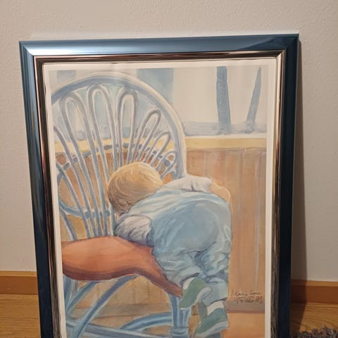 Kukka-aiheinen maalaus, jossa on vaalea kehys. Maalauksessa on vaaleita ja punaisia kukkia vihreällä taustalla. Taiteilija Alli Talpo. Maalauksen koko, korkeus 67 cm, leveys 56 cm.
