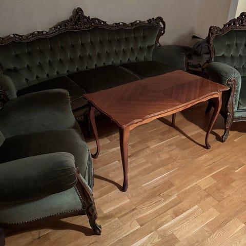 Laadukas Jurvassa valmistettu Rokokoo sohva myytävänä. Kangas ehjä eikä ole hajuja. Kankaassa muutamia painauma sekä pesun jälki. Istuimen verhoilut vetoketjulla. Runko kaikin puolin kunnossa. Kyltti taustassa.