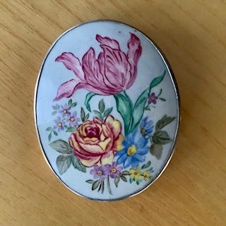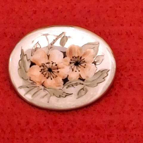 Hopea-posliini rintakoru. Korun halkaisija on 3,8cm. Leimat korussa, 813H ja valkoisella pohjalla numero 14.