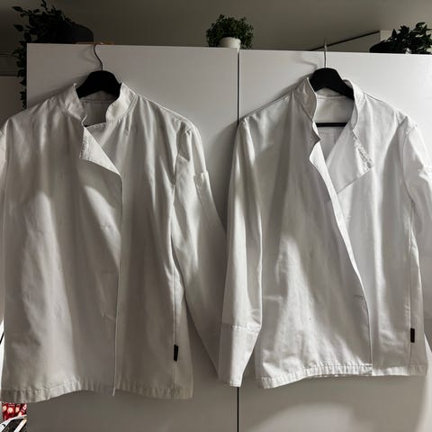 Pakettina kokkivaatteet. Sisältää hejcon 1kpl puoliesiliina, 1kpl esiliina, 2kpl kokkipaitoja (koko S). Leijona merkin mustat XXS koon housut. Esiliinat uuden veroisia, mutta paidoista löytyy muutama pinttynyt tahra. Housut lyhennetty itse, sisälahkeen pituus 68cm.