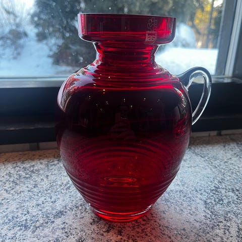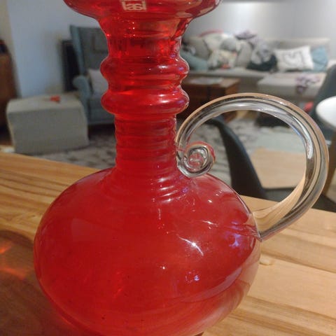 Tamara Alladin Kleopatra maljakko.Riihimäen lasi.Käsinpuhallettua vihreää väriverholasia.Korkeus n. 20cm, halkaisija n. 8,2cm. Malli 1590. Pieni kolhu kannun reunassa, joka näkyy kuvissa. Sopii koriste-esineeksi tai käyttöastiana.