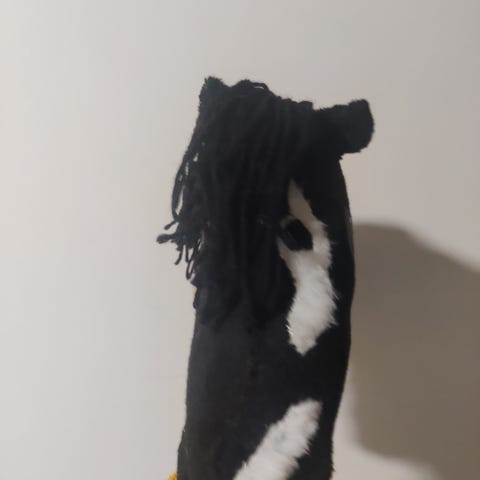 Kepinmitta n. 45 cm, maalattu ja lakattu pinkki, huolittelussa käytetty mustaa kutistesukkaa hännäntyvessä sekä kepinsuulla. Häntä harmaata mohair lankaa.