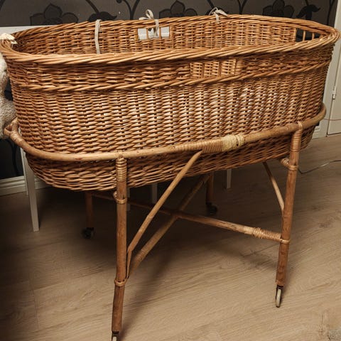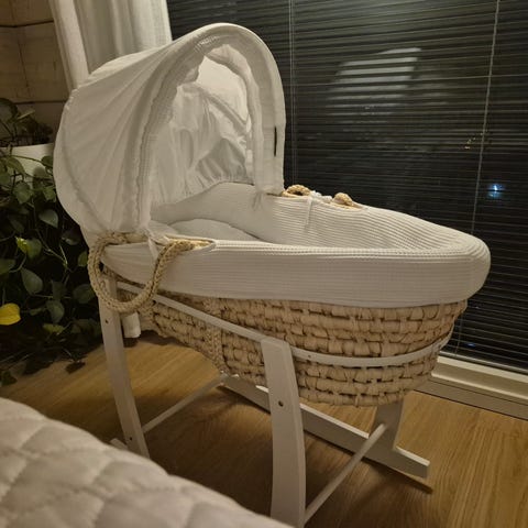 Hyväkuntoinen Carena-merkkinen vauvan / lapsen ensisänky eli mooses-kori, jossa on puiset jalat. Vaalea kori ja beige verhoilu. Sopii vauvoille nukkumiseen ja rauhoittumiseen.