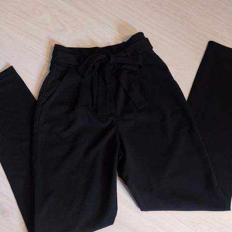 Käyttämättömät mustat housut. Vyötärö on joustava, leveä kuminauha sisällä. Takapuolesta tiukemmat ja lahkeet leveät. Mitat kuvissa.