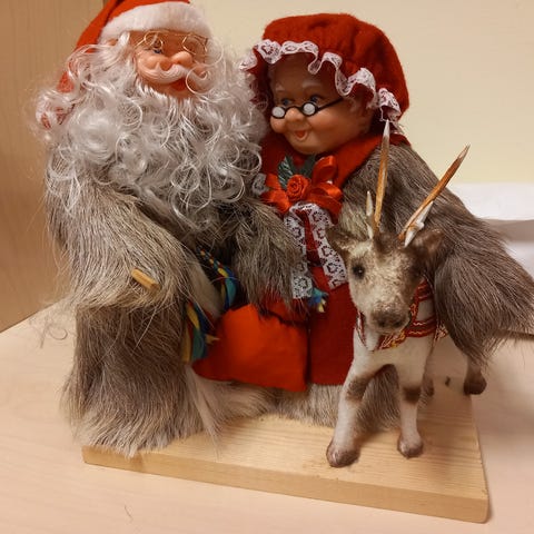 Myydään kuvan uudet joulupukki ja joulumuori, porontaljasta, puinen alusta. Kork.25cm. Hinta yht 25 eur.