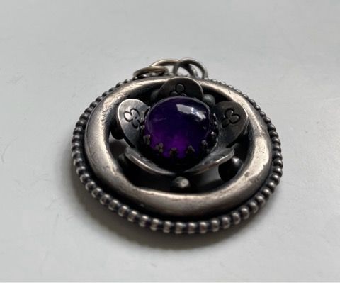 Kaunis hopeinen kukkariipus käsityötä, tekijänä Rauli Kostiainen. Korkeus lenkkeineen 59 mm, 925-leima.
