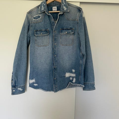 Zaran unisex-mallinen farkkutakki (denim jacket) hoodiellla ja valkoisilla hihansuilla (kontrastihuppu ja sweatshirt-tyyliset hihat).