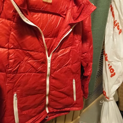 Takissa on kevyt toppaus, sopiva ulkoiluun ja lenkkeilyyn. Takissa on huppu ja vetoketjulliset taskut.