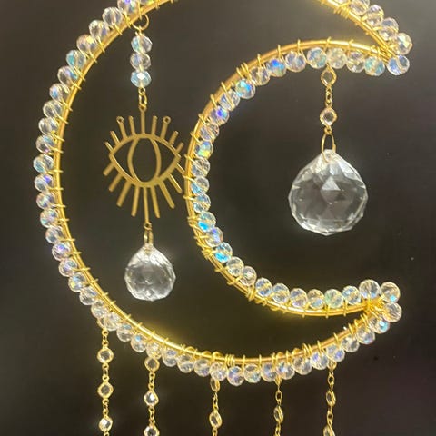 Vihreän eri sävyistä tehty aurinkosieppari. Koristeena myös hopeinen puu. Mitat noin 26cm x 16cm +ketju
