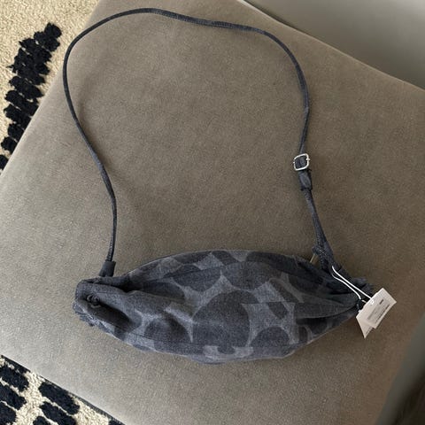 Marimekko pikku karla denim laukku. Pienessä laukussa on kapea metallisoljella säädettävä olkahihna, vetoketjusuljenta ja sisäpuolella yksi vetoketjutasku. Harmaa väri. Pölypussi mukana