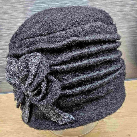 Musta pääosin oljesta tehty Italiassa valmistettu juhlava rusetilla somistettu hattu. Kerran (hautajaisissa) käytetty , Täysin uuden veroinen.