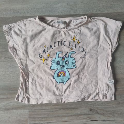 Mainion trikoopaita koko 110/116. Ehjä, haitua pinnassa kts kuva. Pohjaväri tumma keltainen.