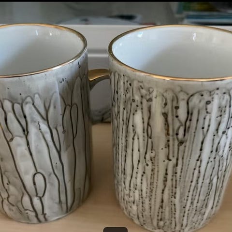 Käsinmaalatut kuppi ja maljakko. Kupin korkeus 8 cm ja halkaisija 10 cm. Maljakon korkeus 10 cm ja halk. 9,3 cm. Olleet vitriinissä käyttämättöminä. 10 € kpl.