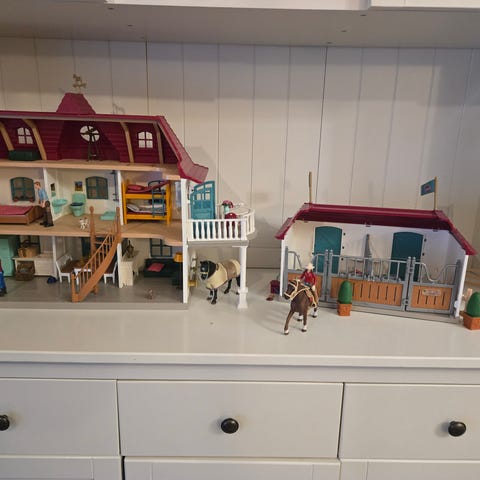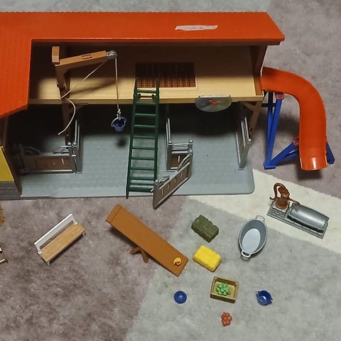 Schleich lato, täysin ehjä ja kaikki osat tallessa (ainoastaan naru uupuu ylhäältä, vinssistä... mutta sitä varmaan löytyy helposti useammasta kodista). Kahdessa kuvassa näkyy talon noin mittoja. Nyt purettu osiin, helppo kasata.