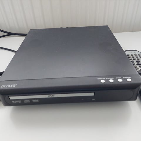Toimiva Denver dvd-soitin ja kaukosäädin.