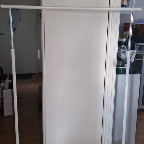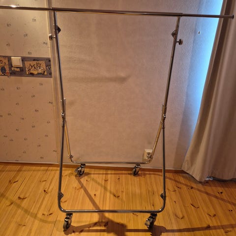 Lojuuko vaatteet siellä täällä mytyssä. Nyt olisi näille selkeä paikka...kahdella henkari ja housu telineellä varustettu tummapuinen teline. Alhaalla vetolaatikko. Tukeva ja pysyy hyvin pystyssä.