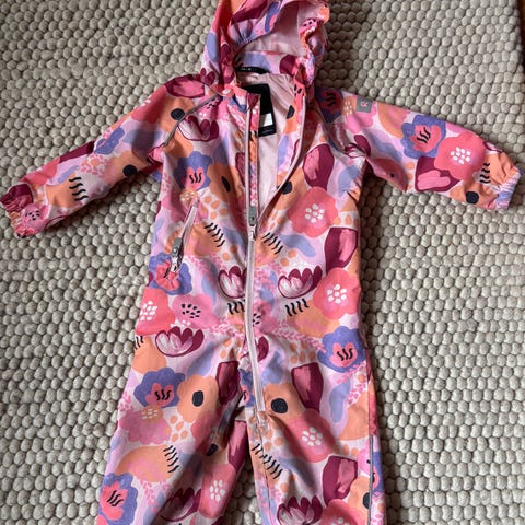 ReimaTec välikausihaalari koko 92. Pohjaväri tumman/mustanruskea, lähikuvassa näkyy oikeampi sävy. Muuten vielä siisti ja hyväkuntoinen, mutta peppua paikattu tekstiilipaikalla - katso kuva. Sisällä henkselit, joilla haalari pysyy paremmin päällä, sekä kiristettävä vyötärö.
