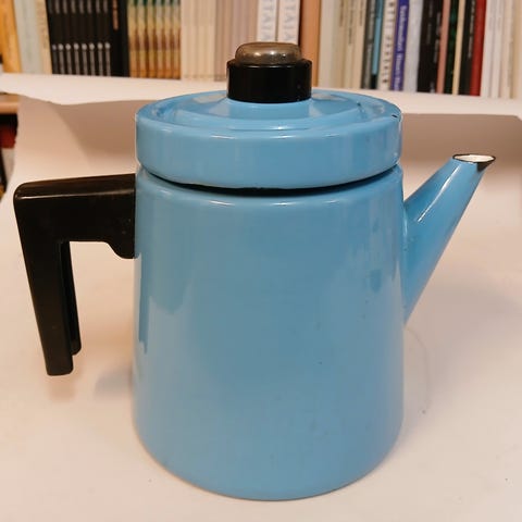Antti Nurmesniemen Finelille suunnittelema kahvipannu, ehjä, ainoastaan nokasta emalia hieman lähtenyt (näkyy kuvassa)