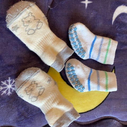 Tekokuituisesta, kutittamattomasta langasta neulotut, pitsivartiset sukat noin 1-3 kk ikäiselle