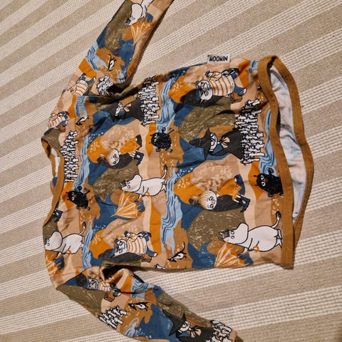 Muumi-merkkinen harmaa-musta -raidallinen paita. Käytetty ja kuvassa alkaa olemaan joitain käytön jälkiä. On kuitenkin ehjä ja puhdas.