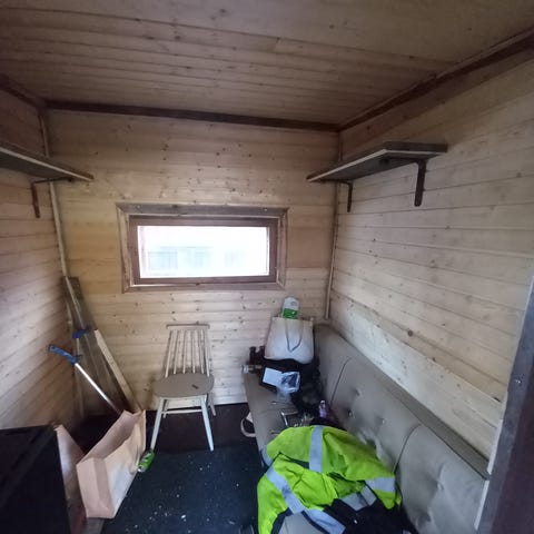 Ulkoseinät tummanharmaaksi maalattua peltiä. Sähköliitäntä.