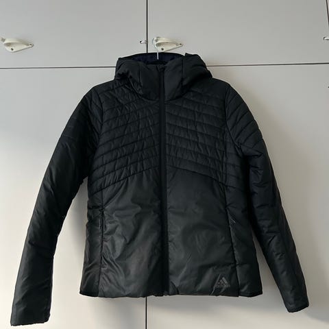 Adidaksen a-linjainen pitkä musta untuvatakki, koko M. Melko reilua mitoitusta, menee myös L-kokoa käyttävälle. Kunnossa ei muuta moitittavaa kuin hihassa oleva Adidaksen merkki hieman kulunut.