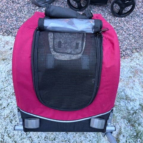 Peräkärry soveltuu koirille ja muillekkin eläimille, tai jopa tavaran kuljetukseen. Noin 5 kertaa käytetty. Jäänyt käyttämättömäksi kun koirani oli liian painava kärrylle. Repeämä tuli kärryn kaatuessa mutkassa, mutta ei ole revennyt isommaksi vaikka kärryä käytin pari kertaa repeämän jälkeen.