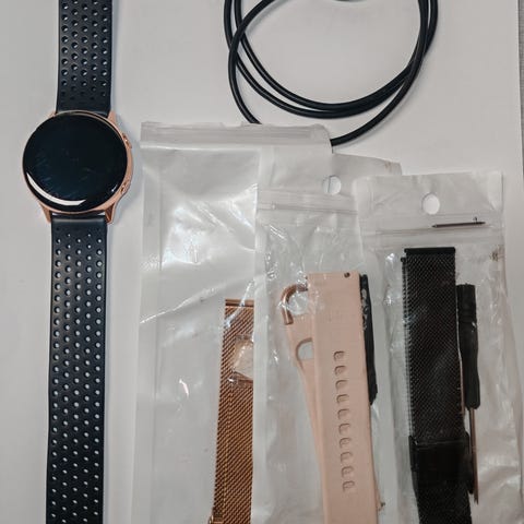 Mukaan latausjohto (ei alkuperäinen Samsungin, ns. bulkkilaturi – lataa kellon normaalisti)