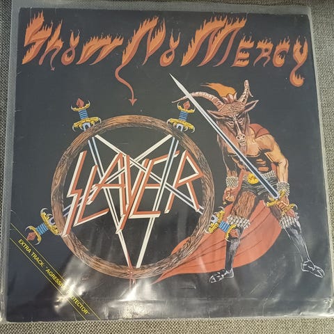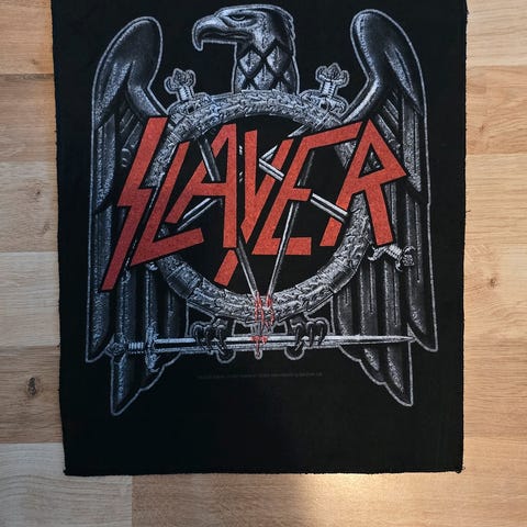 Puinen jalusta, jossa on ikoninen Slayer-yhtyeen kotka-logo miekkoineen. Täydellinen heavy metal -musiikin faneille!