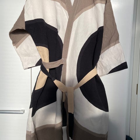 Uusi, upea melkein mekkomainen aamutakki. Sivuilla taskut