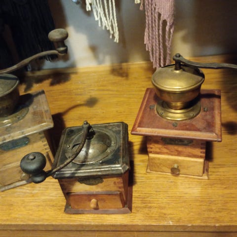 Hyväkuntoinen kahvimylly, aikoinaan tällä on jauhettu pannukahvin papuja. Säilytetty lämpimässä.
