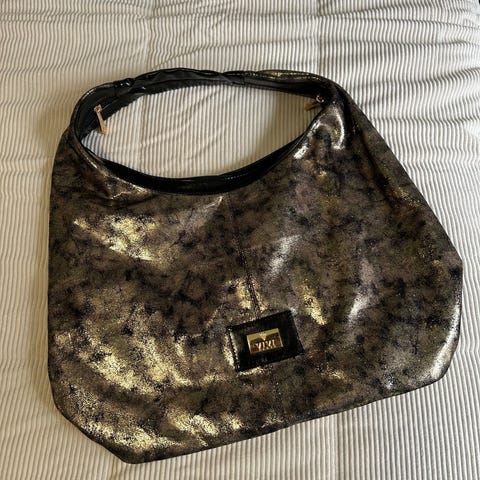Vähän käytetty laukku olkahihnalla. Erittäin tilava ja hyvä. Musta nahkaa muistuttava materiaali. Vetoketjulla.