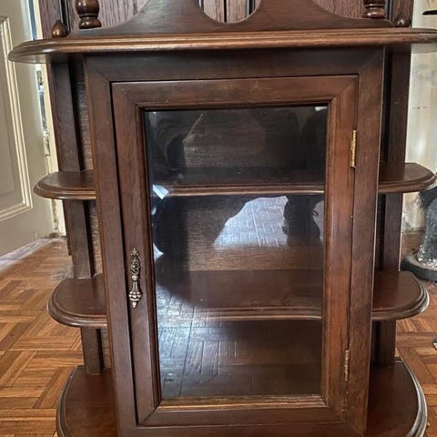 Säilytyskaappi, jossa yläosassa lasiovet ja alaosassa puiset ovet. Sopii erilaisten tavaroiden säilytykseen ja esillepanoon. Materiaali puu ja lasi. Väri tummanruskea.