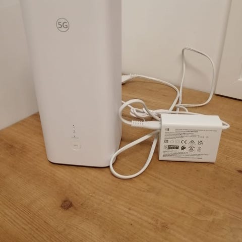 DNA H158 Modeemi 5G WiFi, valkoinen väri, langaton verkkolaite, sisältää virtalähteen ja liitäntäkaapelit. Käytetty modeemi kotikäyttöön langattoman internetyhteyden luomiseen.