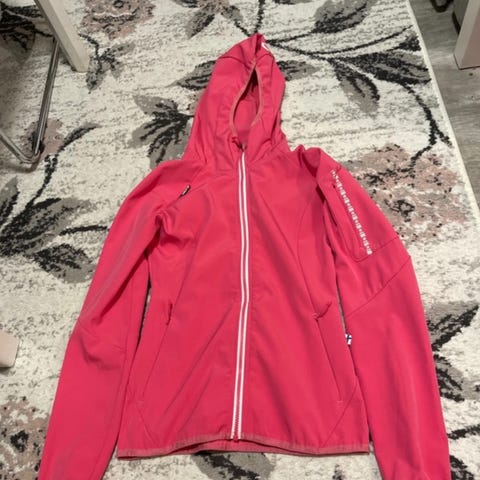 Vaaleanpunainen, hupullinen softshelltakki. Siistikuntoinen, hihansuiden kiristysosat menneet poikki (olleet muovia).