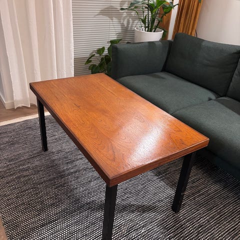 Askon taannoista mallistoa edustava alkuperäiskuntoinen tiikki-sohvapöytä 1960-luvun jälkipuoliskolta. Kolhuton ja tukeva, normaalilla tavalla ikääntynyt, ei vikoja eikä siivottavaa. Ryhdikäs, suora ja samantien käyttövalmis. Kannen mitat 144 x 52 cm, korkeus 51 cm, paino n. 12 kg.