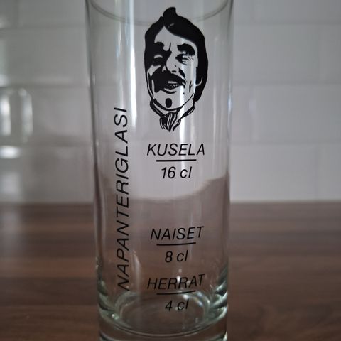 Drinkkilasi, missä Jean Pierre Kuselan mittataulukko, Jean 4 cl, Pierre 8 cl, Kusela 16 cl.