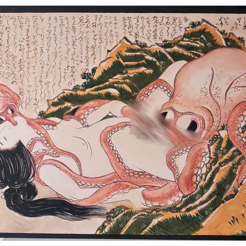 Mustavalkoinen taiteellinen juliste, jossa on piirros kahdesta henkilöstä. Julisteessa on perinteinen japanilaistyylinen teksti taustalla. Kuvassa on myös lisätty koristeellinen malja, jossa on punaisia kukkia.