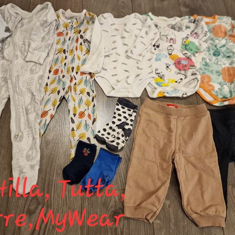 Vauvan vaatteet koossa 68. Käyttämätön, uusi Metsola pipo myös mukana (0 - 1 v). Yöhaalarit ja housut lisänä, joiden kunto hyvä käytetty.