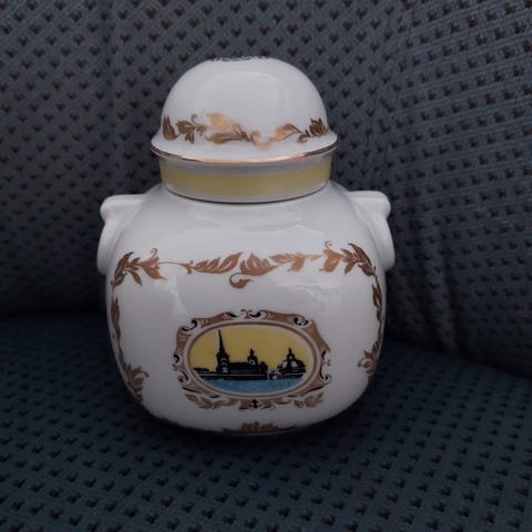 Uudenveroinen, ehjä ja täysin kunnossa. Pohjassa leima. Molemmat korkit ehjiä ja kunnossa. Sisällä on teen säilyvyyden vuoksi pieni korkki ja päällä on vielä koristeellinen pannu korkki.