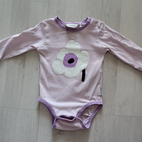 Marimekon lila Unikko body. Käytetty vain vähän ja muutoin tosi hyvä kunto, mutta Unikkokuviossa on kuten tyypillistä hieman halkeilua, edelleen kuitenkin oikein siisti (kuva 3).