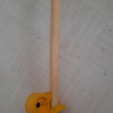 Puinen työntölelu ankka. Lelupaja. Pituus 83 cm. Hyväkuntoinen, joskin on käytönjälkiä.