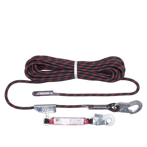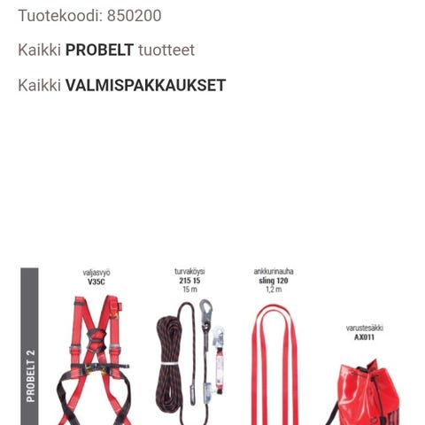 KÖYSI 15m: Turvaköysi Probelt on pystytyöskentelyyn tarkoitettu joustavalla käydellä varustettu putoamisenestolaite, joka kestää enintään 140 kg:n käyttäjän painon. Liukutarrain ja nykäyksen vaimennin kuuluu laitteeseen.