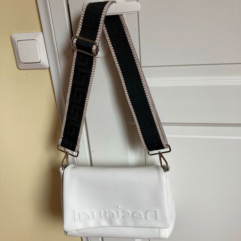 Olkalaukkuhihna, jossa on sininen ja harmaa kuviointi. Hihna on säädettävissä pituudeltaan ja valmistettu kestävästä materiaalista. Sopii käytettäväksi erilaisten laukkujen kanssa.