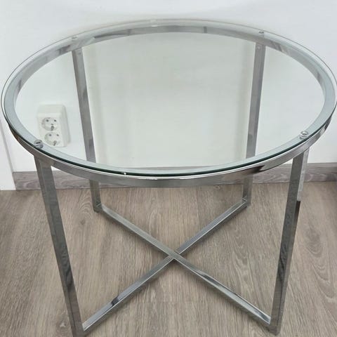 Myydään ovaalin muotoinen lasipöytä jossa kolme jalkaa