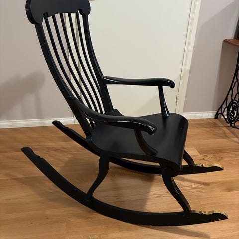 Kuvien keinutuoli. Rakenteeltaan hyvä mutta joku on joskus maalannut pensselillä tuon valkoiseksi. Ehkä maalin poistamalla saisi alkuperäisen puupinnan näkyviin mutta minusta noissa saa ikä näkyäkin. Ei toinna ruveta lähettämään eli vain nouto.