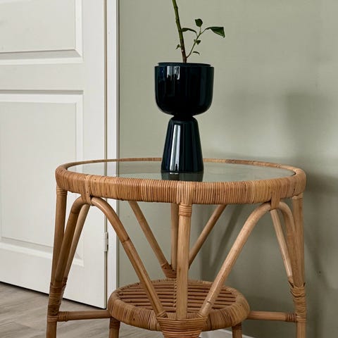 Lumikenkä tuoli, lumikenkä pöytä, rottinkituoli ja rottinkilaatikosto.